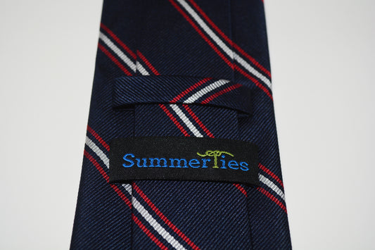 Red and White Stripes on Navy Necktie - Navy, Woven Silk