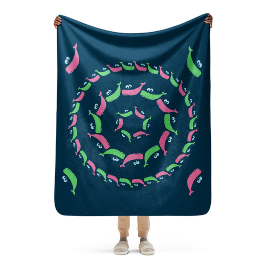 Sperm Whale Sherpa blanket - Pink and Green on Navy
