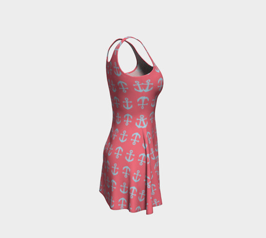 Anchor Toss Flare Dress - Light Blue on Coral