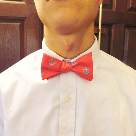 Anchor Bow Tie - Light Blue on Coral, Printed Silk